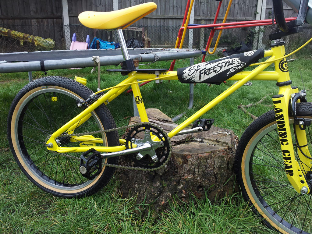 got se powerwings in black,really high rise ones..yellow orig ame,s..black proneck stem..880 dc brakes in black..orig se seatpost in chrome..se freestyle platform/seatclamp..black tuffs..tioga st tyres..black viscount mx seat..takagi 1pc crack..black suntour 42t chainwheels whith sugino spider..shimano sx peds in black