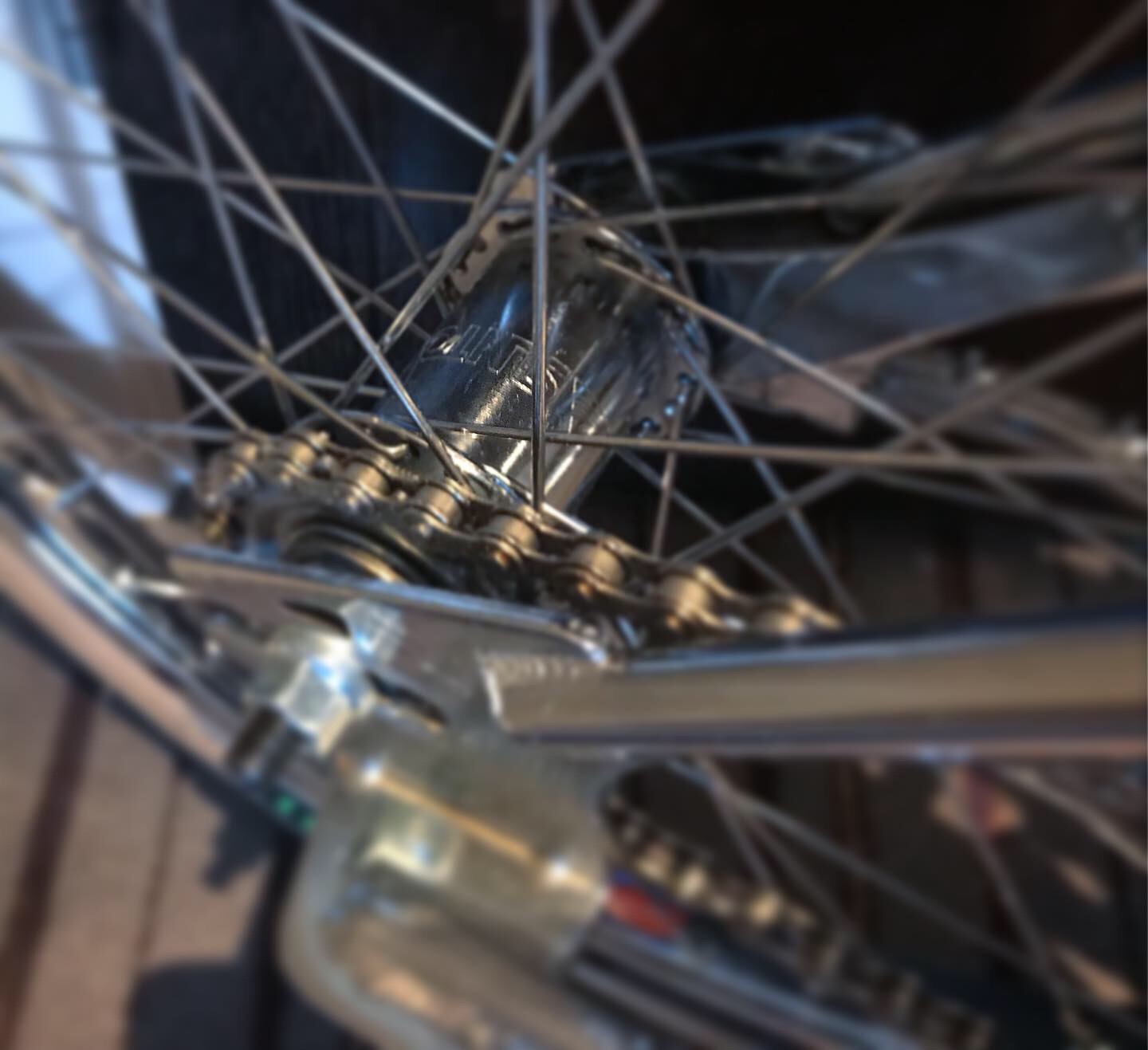 Had a nice set of  chrome Araya 7x rim for this. Like with the cranks Terry didn’t go with the obvious Team Master parts. He told me he always used 401s and on this bike it was 36h Araya 7x with a coaster. So last night I started my love/hate task of delacing the rear wheel and adding the coaster hub...