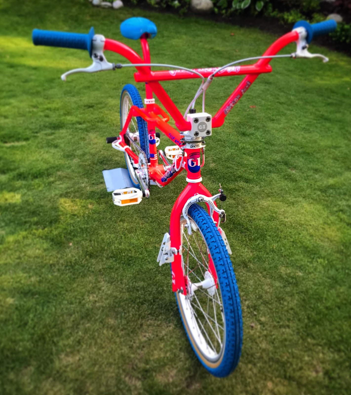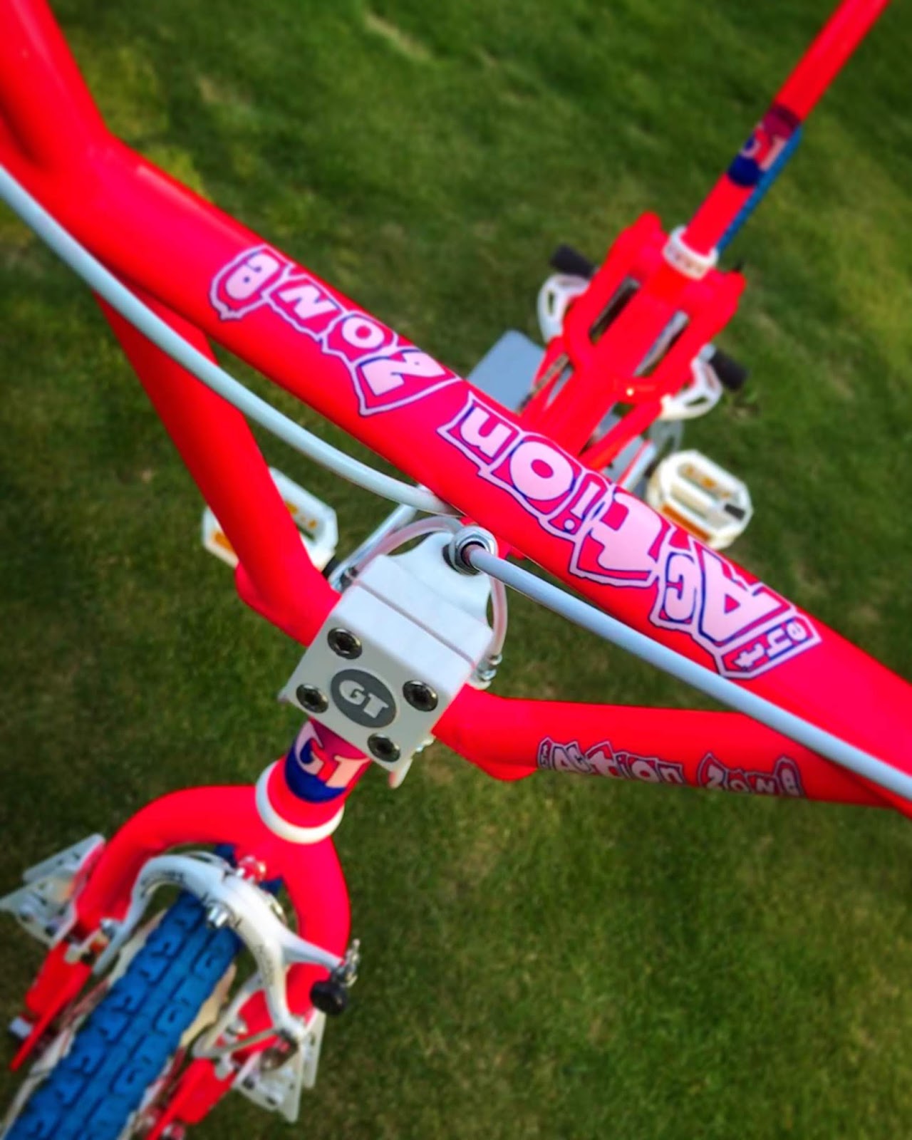 Just finished the last tweaks on my ‘87 PFT day glow pink with blue parts, now sporting AZ bars.